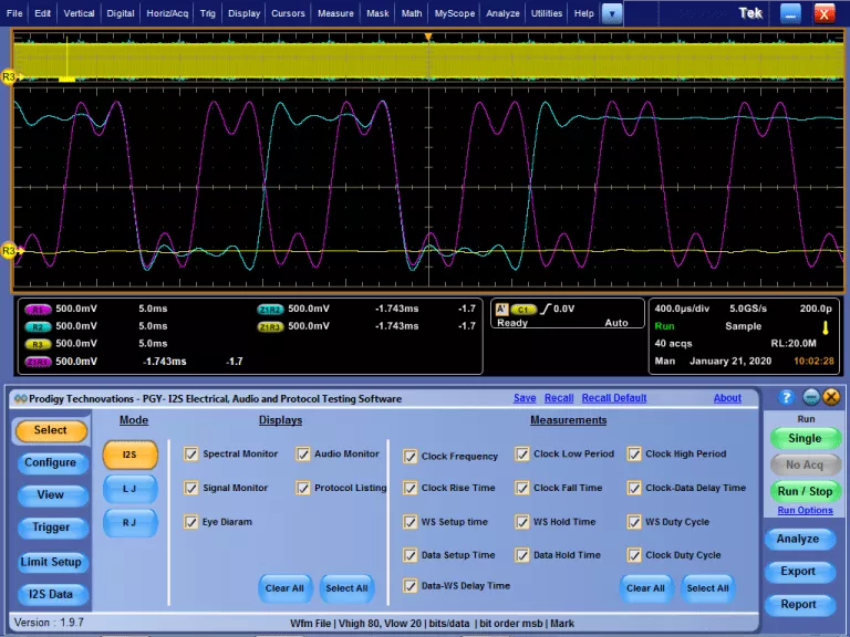I2S Electrical Validation and Protocol Decode Software offers electrical measurements compliance testing and protocol decoding as specified in the I2S specification. PGY-I2S Electrical validation and Protocol decode software runs in Tektronix Oscilloscope and provides electrical measurements and protocol decode at the click of a button. This allows engineers quickly check for I2S compliance and flexibility to debug the failure. In addition to this engineers can decode the command and response of I2S to debug the communication. PGY-I2S takes advantage of digital channels of MSO and provides the decoding of I2S data lines.
