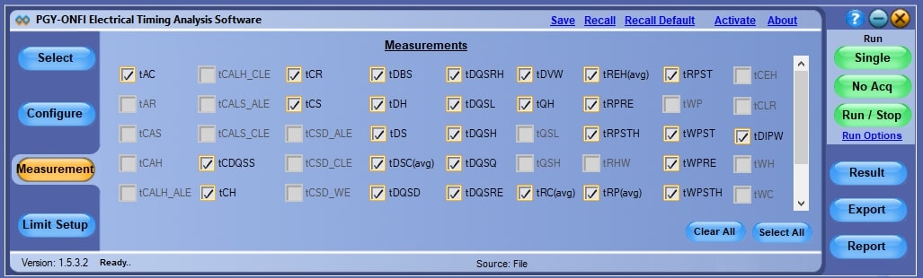 ONFI Electrical Timing Analysis Software offers electrical measurements compliance testing as specified in ONFI specification. PGY-ONFI Electrical Timing Analysis software runs in Tektronix Oscilloscope and provides electrical measurements at the click of a button. This allows engineers quickly check for ONFI compliance and flexibility to debug the failure. In addition to this engineers can decode the command and response of ONFI and debug the communication. PGY-ONFI takes advantage of digital channels of MSO and provides the decoding of ONFI data lines.