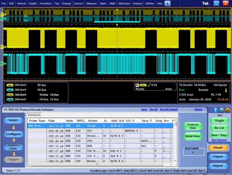 I3C Protocol Decode Software offers protocol decoding as specified in the I3C specification. PGY-I3C-PD Protocol decode software runs in Tektronix Oscilloscope and provides protocol decode at the click of a button. This allows engineers quickly check for I3C compliance and flexibility to debug the failure. In addition to this engineers can decode the command and response of I3C to debug the communication. PGY-I3C-PD takes advantage of digital channels of MSO and provides the decoding of I3C data lines.