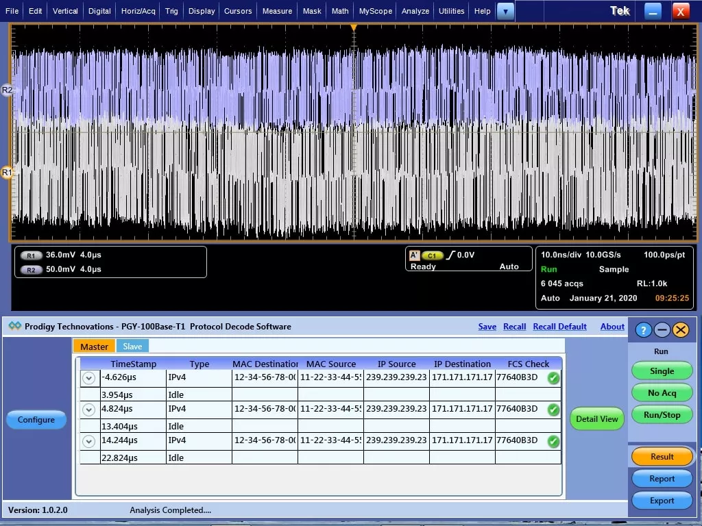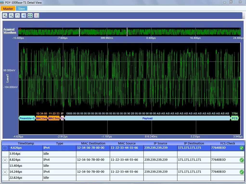Users can now feed the output of the directional coupler to Tektronix Oscilloscope for time-domain view. PGY-100BaseT1 protocol decode software runs in Tektronix Oscilloscope, easily decodes PAM3 encoded 100BaseT1 signal. This enables the engineers to quickly understand the protocol activity between the Master and Slave ECU.