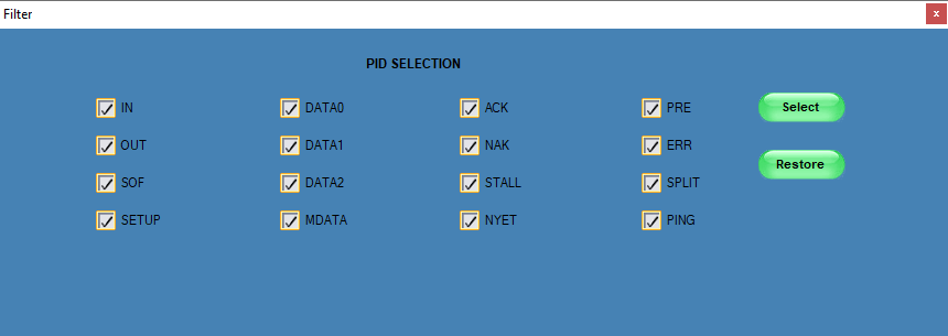 Simple easy-to-use HSIC protocol-aware trigger features allow engineers to capture HSIC signals at specific events in the HSIC bus.Select any of the live channels Ch1 to CH4 as trigger sources and set the trigger pattern. The trigger pattern could be either a Sync pattern to any PID packet. PGY-HSIC Software has the flexibility to choose a sync pattern that ends the ‘00’ pattern or ‘11’ pattern at the end of the 32-bit sync pattern. The threshold level allows the user to identify the right threshold to distinguish between logic 1 and logic 0. Protocol Aware trigger supporting trigger on sync and all PIDs.