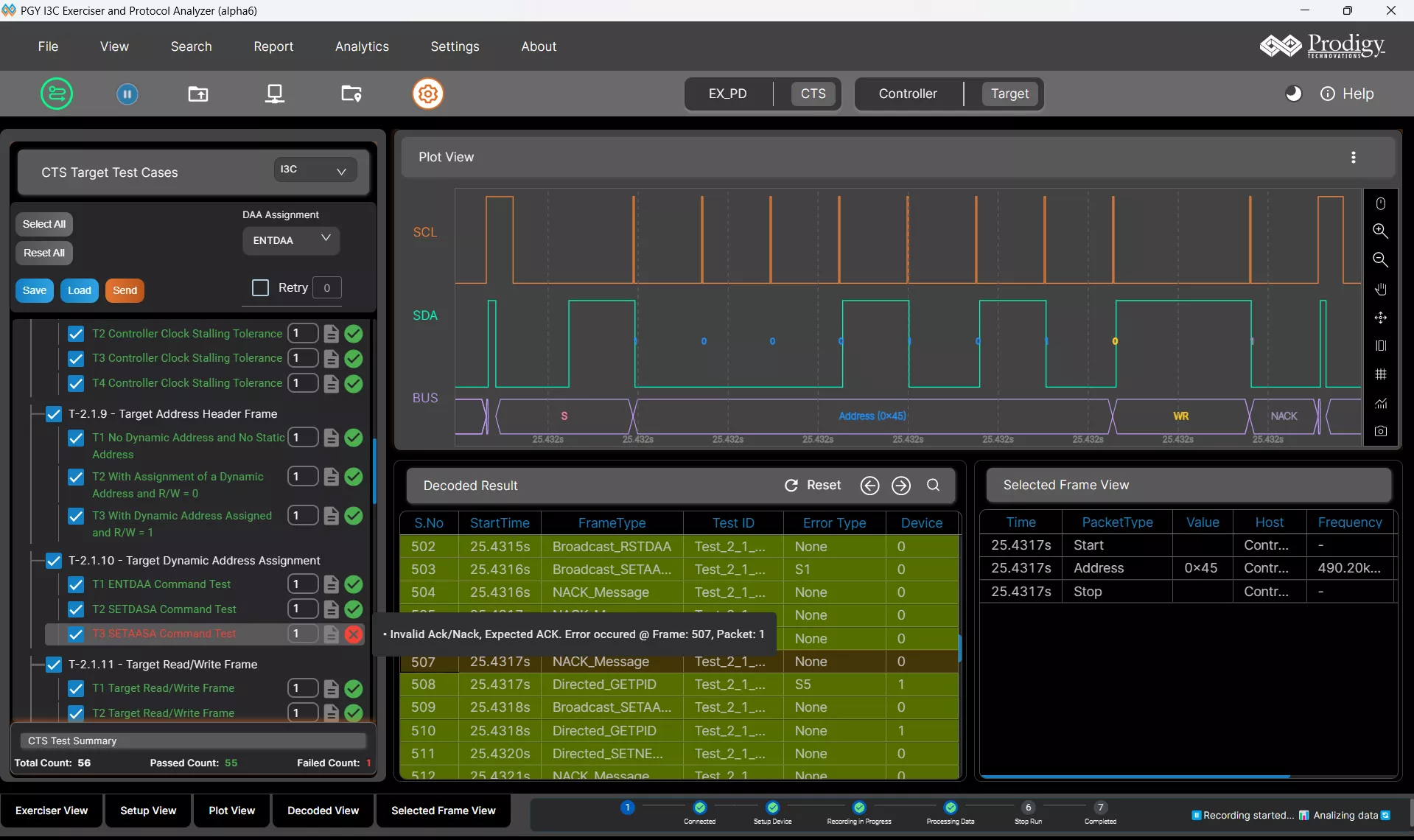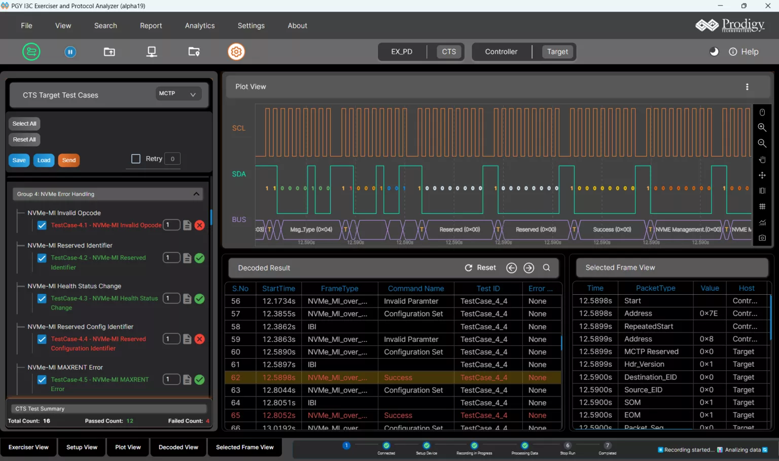 PGY-I3C-EX-PD drives all these test cases traffic to DUT at a click of a button. The software analyses the DUT response for conformance to tests and report pass/fail status for each test case. It also provides a detail report for test case failures for easy debugging of the failed test cases.