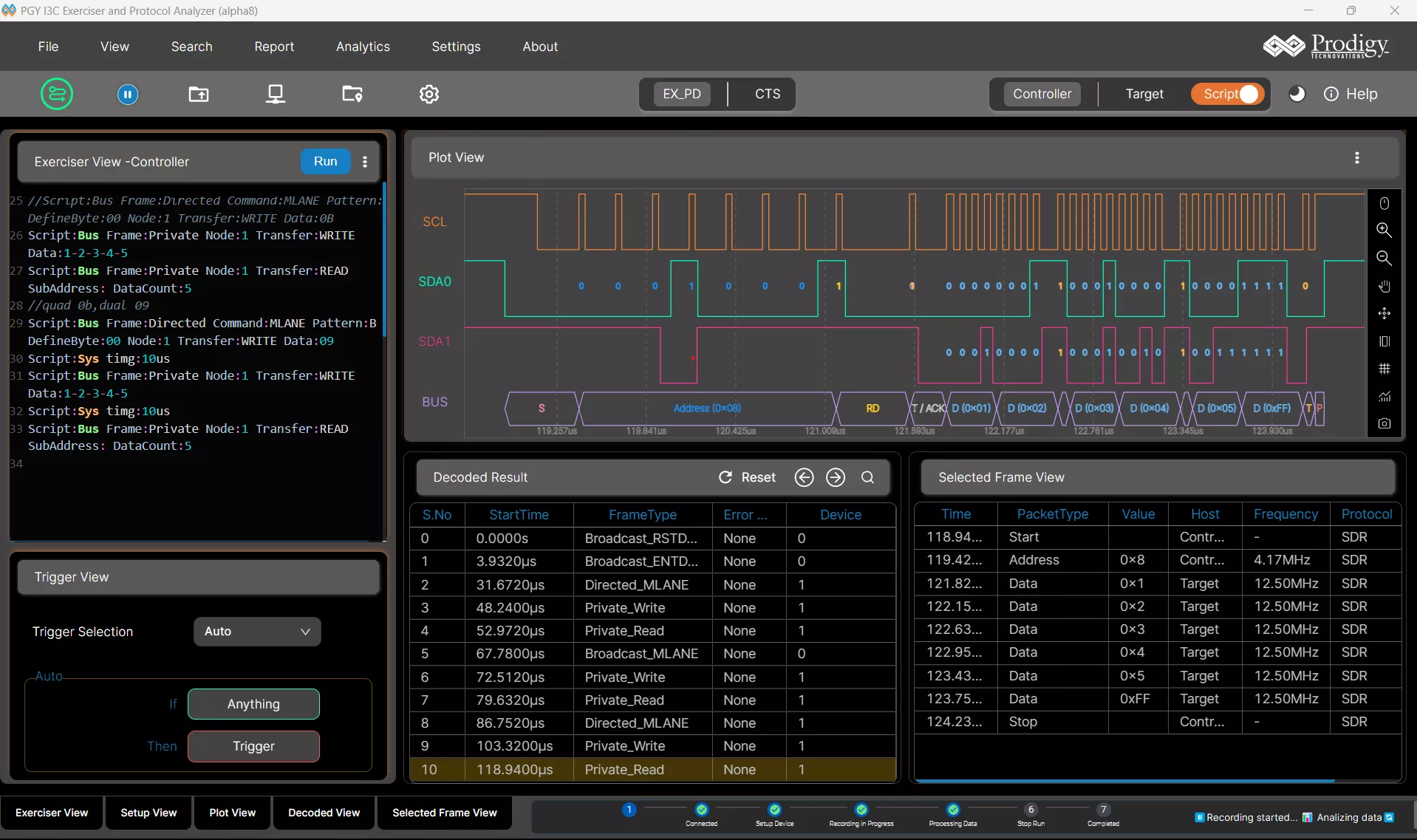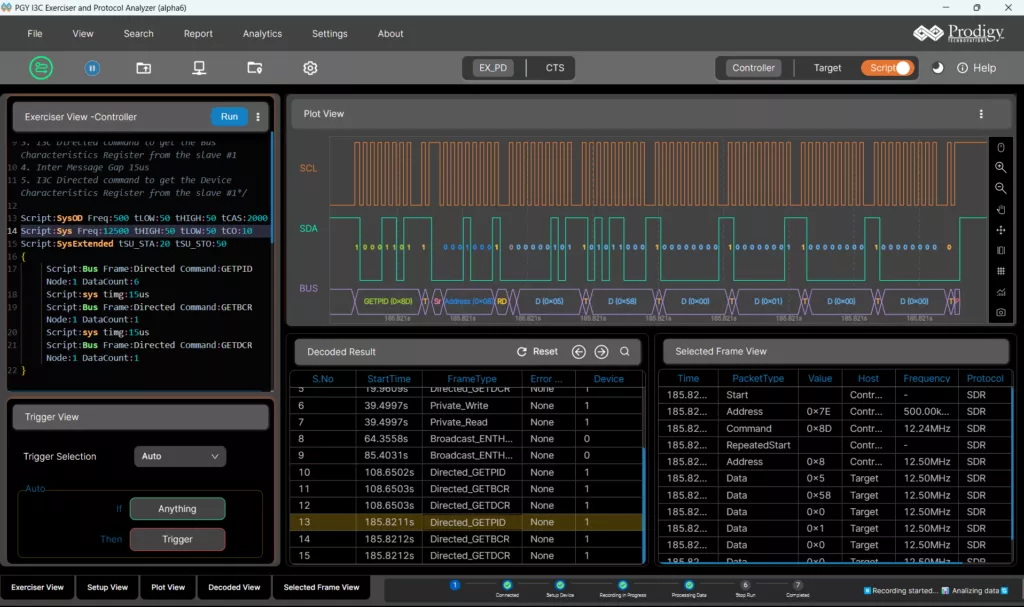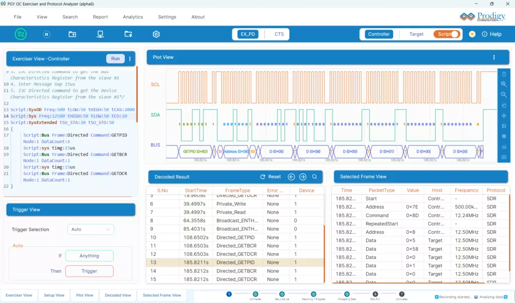 Multi-domain View provides the complete view of I3C Protocol activity in a single GUI. Users can easily set up the analyzer to generate I3C/I2C traffic using the GUI or script. Users can set different trigger conditions from the setup menu to capture protocol activity at specific events and decode the transactions between the controller and target. The decoded results can be viewed in the timing diagram and protocol listing window with auto-correlation. This comprehensive view of information makes it an industry- best offering and an easy to-use solution to debug the I3C protocol activity.