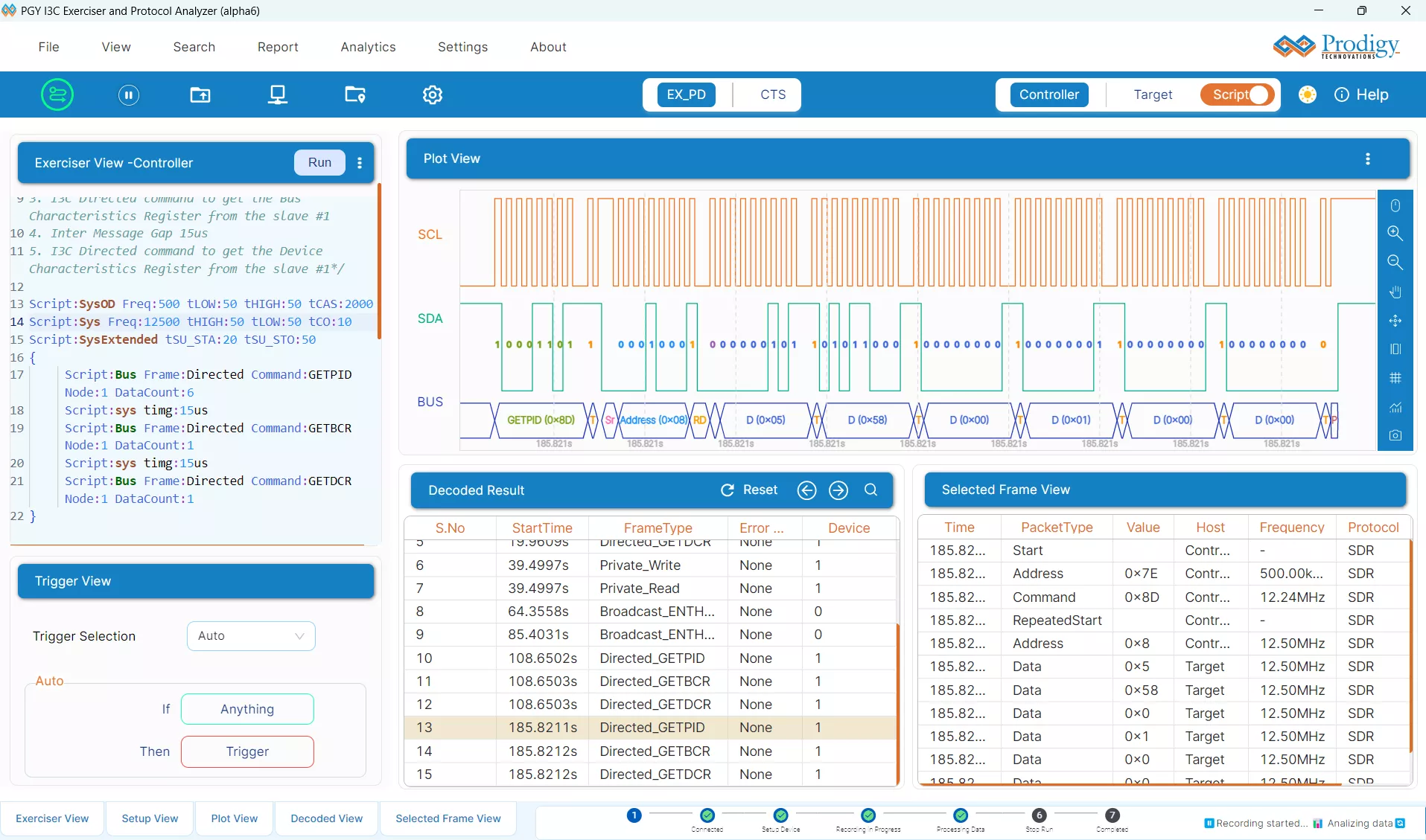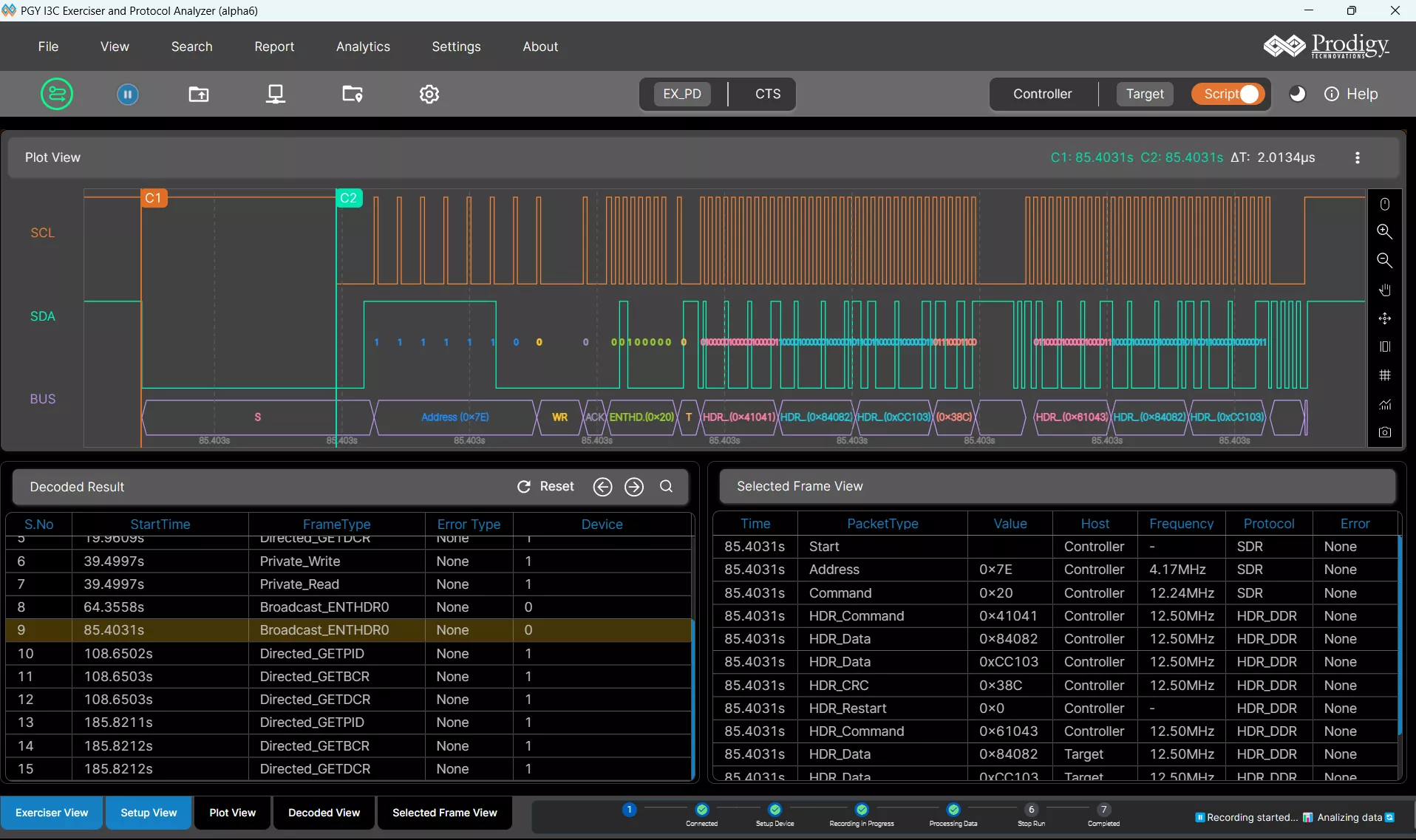 The script performs device enumeration by issuing the Broadcast ENTDAA CCC, which enables the controller to assign dynamic addresses to all connected targets. following which the controller sends a Directed GETPID command to retrieve the Provisional ID (PID) of the assigned target, ensuring proper device identification. Following this, the controller performs a private SDR write operation to transmit data into a specific register, and subsequently executes a private SDR read from the same register to validate the transaction by confirming that the written data has been correctly stored. The entire sequence is executed at a bus frequency of 500 kHz with a 50% duty cycle. Users can configure various timing parameters as per their test scenario.