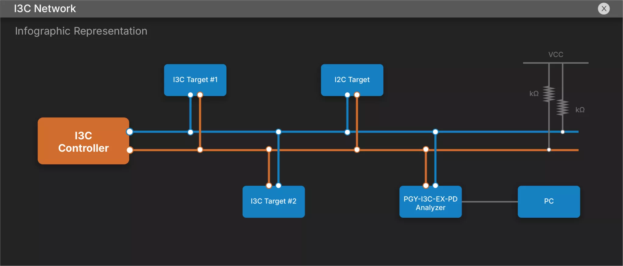 PGY-I3C-EX-PD unit supports legacy I2C devices on the I3C network. User can send I2C traffic targeting to I2C devices. User can configure I3C bus with I2C target.