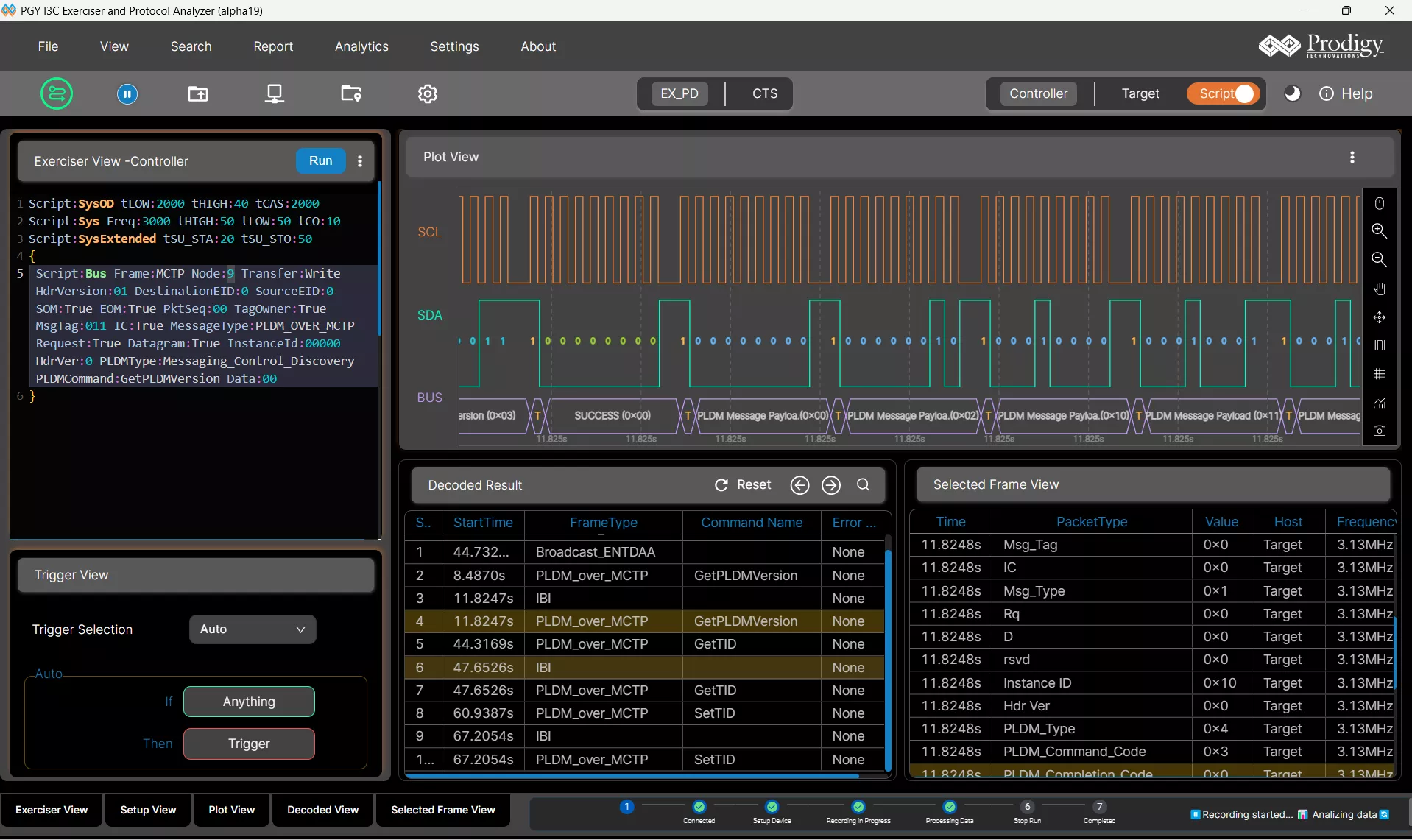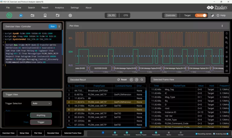 PGY-I3C-EX-PD supports PLDM protocol scripting analysis for easy testing of PLDM supported devices. User can generate PLDM traffic by easy to auto guided script and inject to the device under test (DUT). The tester analyzes this traffic and display response from the DUT and list the communication between tester and DUT.