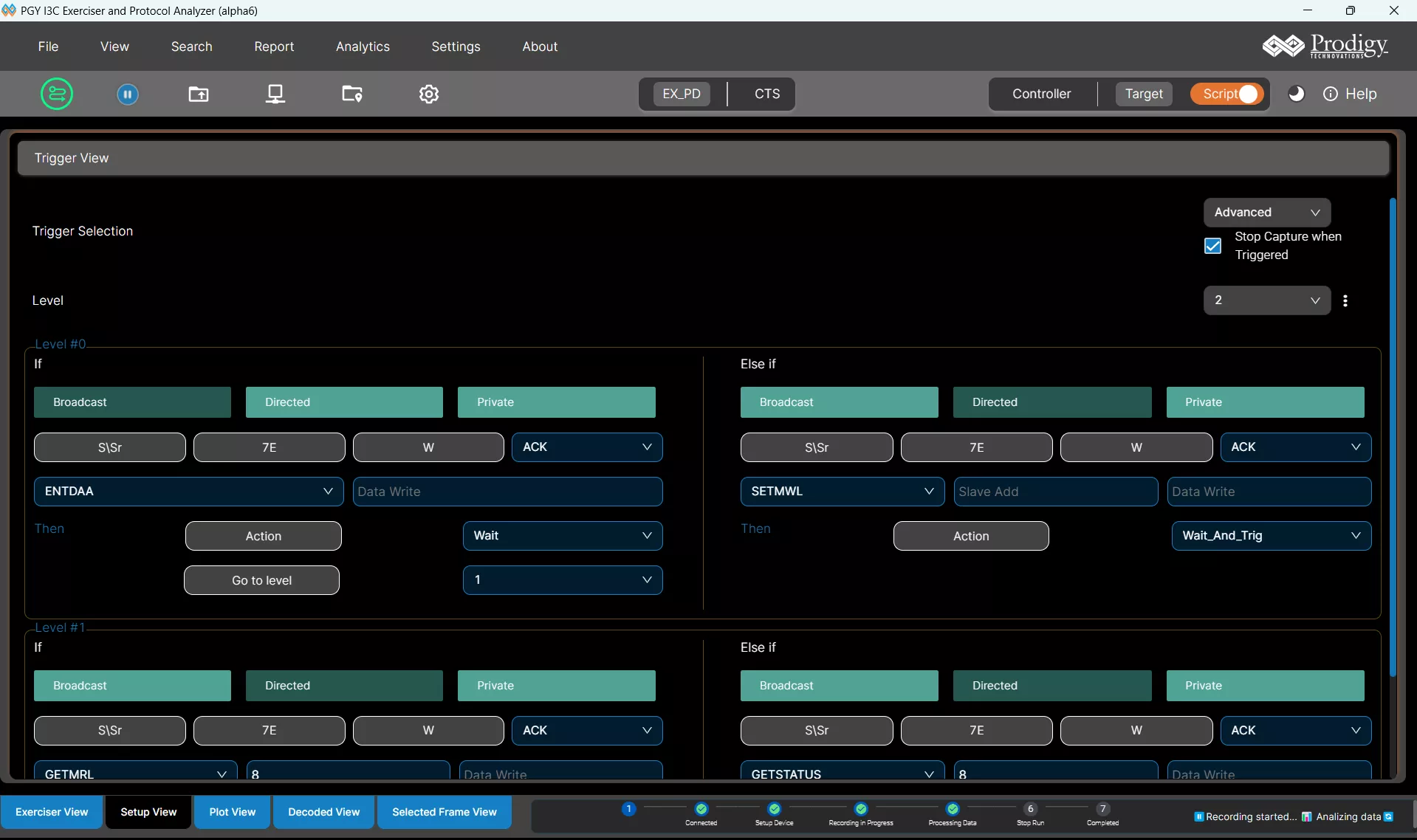 PGY-I3C-EX-PD supports auto, simple and advanced trigger capabilities. The analyzer can trigger on any of the protocol packets such as broadcast, directed or private messages. Advanced trigger provides the flexibility to monitor multiple trigger conditions and can set multiple state trigger machines.
