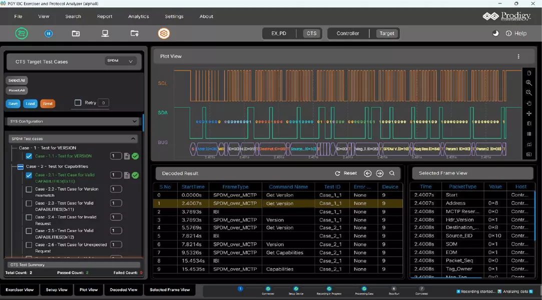 DMTF offers a list of SPDM Conformance Test Cases which are integrated with PGY-I3C-EX-PD. User can select each test case and drive the relevant SPDM Protocol traffic to the DUT using off the shelf test cases. The response of the DUT is analyzed and test result is reported by PGY-I3C-EX-PD. The tester can also generate the test report for records.