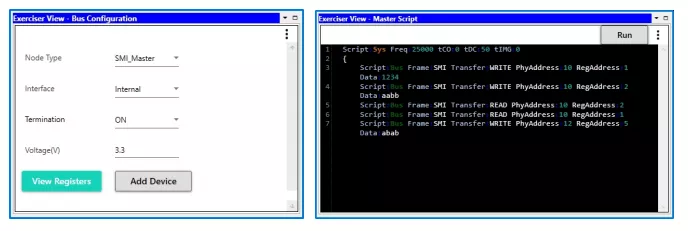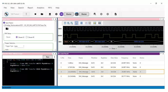 PGY-MDIO-EX-PD supports MDIO traffic generation using GUI and Script. Users can generate simple traffic generation using the GUI to test the DUT. Script-based GUI provides flexibility to emulate the complete expected traffic in the real world including error injections. In this sample script user can generate MDIO traffic as below:
