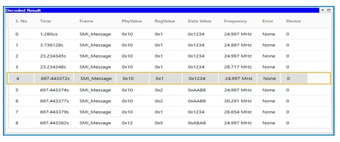Multidomain View provides the complete view of MDIO Protocol activity in a single GUI. Users can easily set up the analyzer to generate MDIO traffic using a GUI or script. Users can capture Protocol activity at a specific event and decode the transition between Master and Slave. The decoded results can be viewed in the timing diagram and Protocol listing window with autocorrelation. This comprehensive view of information makes it the industry’s best, offering an easy-to-use solution to debug the MDIO protocol activity.
