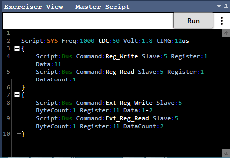 PGY-RFFE-EX-PD supports RFFE traffic generation using GUI and Script. Users can generate simple traffic generation using the GUI to test the DUT. Script-based GUI provides flexibility to emulate the complete expected traffic in the real-world including error injections. In this sample script user can generate RFFE traffic as below: