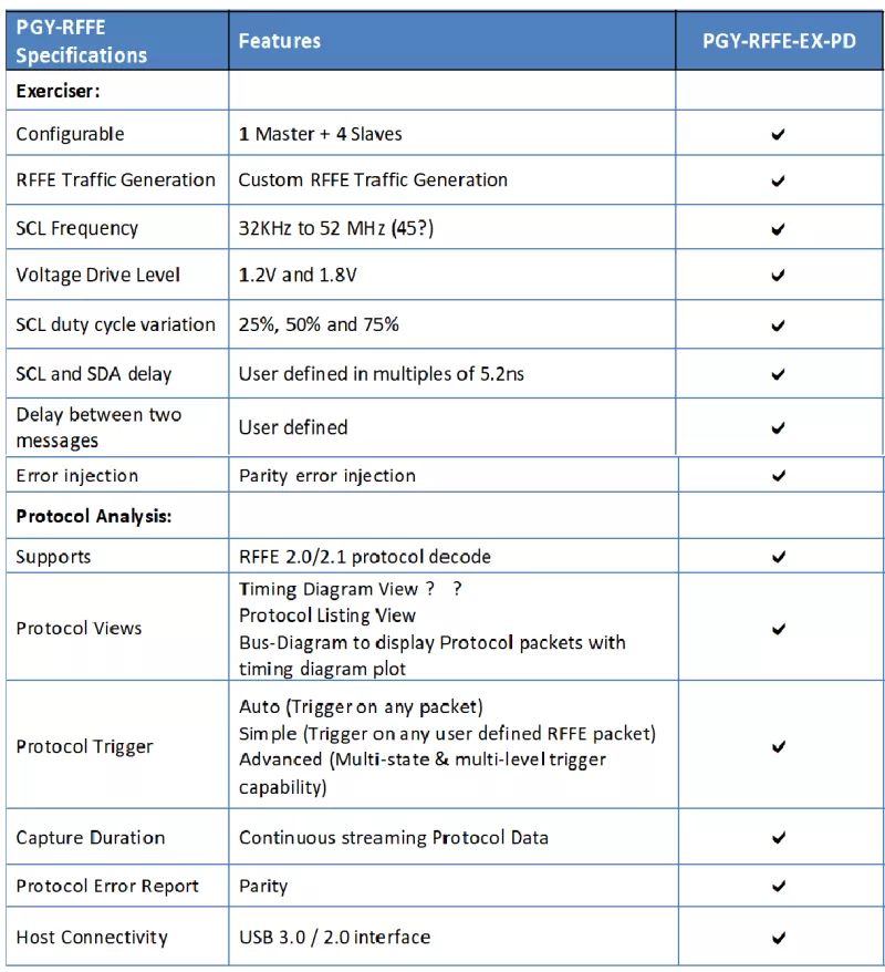 PGY-RFFE-EX-PD is the leading instrument that enables the design and test engineers to test the RFFE interface for its specifications by configuring PGY-RFFE-EX-PD as master/slave, generating RFFE traffic with error injection capability, amplitude variation, and decoding RFFE Protocol decode packets.