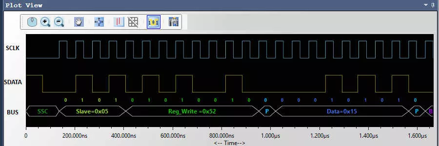 The timing view provides the plot of SCLK and SDATA signals with a bus diagram. Overlaying of Protocol bits on the digital timing waveform will help easy debugging of Protocol decoded data. Cursor and Zoom features will make it convenient to analyze Protocol in the timing diagram for any timing errors.