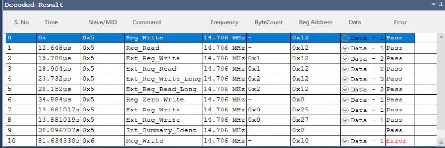 Multi-domain View provides the complete view of RFFE Protocol activity in a single GUI. Users can easily set up the analyzer to generate RFFE traffic using a GUI or script. Users can set different trigger conditions from the setup menu to capture Protocol activity at specific events and decode the protocol transactions between Master and Slave. The decoded results can be viewed in the timing diagram and Protocol listing window with autocorrelation. This comprehensive view of information makes it the industry’s best, offering an easy-to-use solution to debug the RFFE protocol activity.
