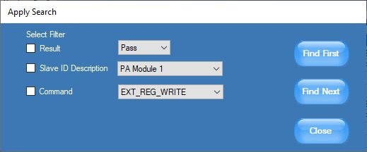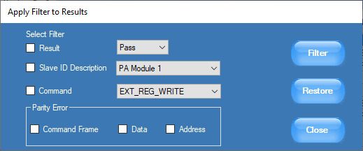 It is extremely challenging to view information of interest while there are hundreds of protocol transactions taking place between various devices. These problems compound during protocol analysis of a long record length. PGY-RFFE software solves this problem using the filter feature. By filtering information for Slave ID or specific command, or parity error type, the user can view only specific data of interest. Filters provide filtering of information using individual packet content or a combination of packet contents.