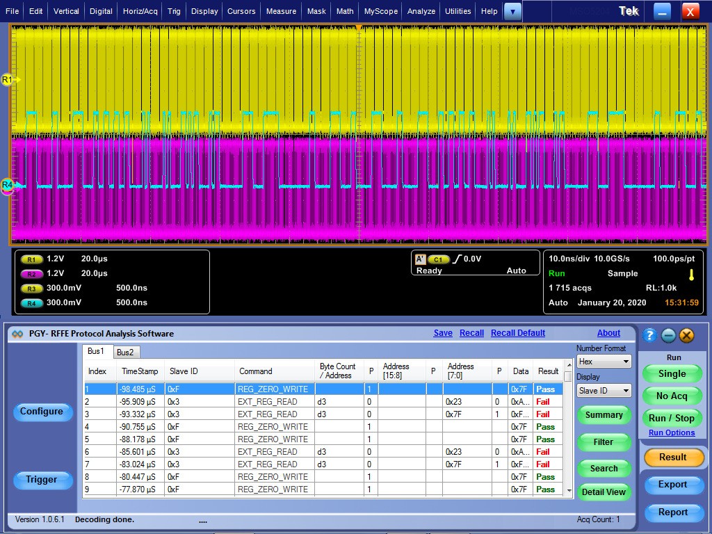 RFFE Protocol decoded data is displayed as above. PGY-RFFE software processes up to 125MB record length and displays all the RFFE protocol packets. The software analyses each RFFE packet for missing SSC, parity bit error in address, command, and data bytes. PGY-RFFE software identifies any RFFE packet with missing SSC. This ensures that each RFFE packet meets the protocol specifications of RFFE. PGY-RFFE software displays result for each RFFE protocol packet whether pass or fail.