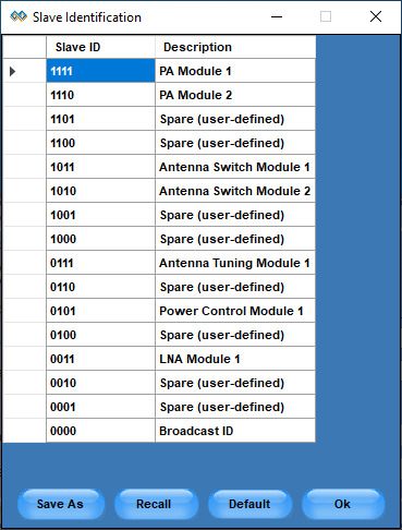 PGY-RFFE Software provides the flexibility to view the decoded data in the symbol table. RFFE specification documents provide guidelines to describe the Slave IDs. PGY-RFFE software has the default slave ID table. However, the user can edit the default table and apply the custom described slave IDs for easy analysis of protocol activities. This symbol table is used for easy trigger setup, protocol analysis, filter, and search features.