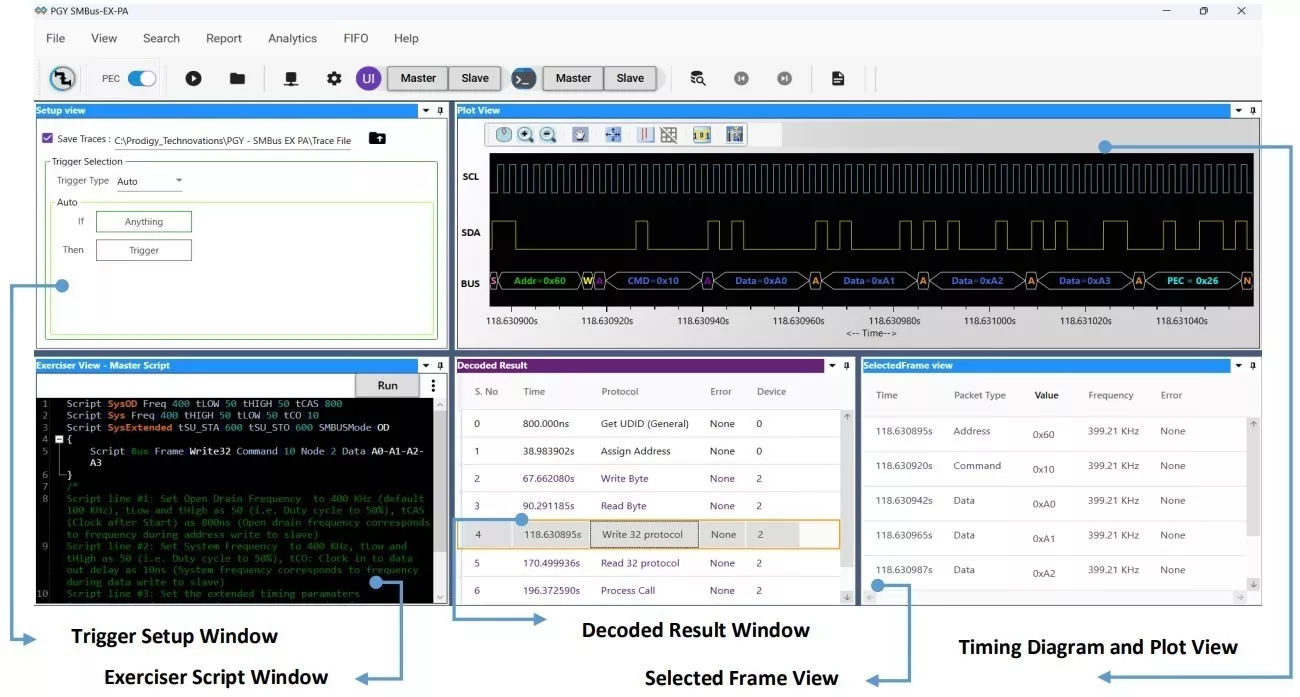 SMBus Protocol Exerciser and Analyzer (PGY-SMBus-EX-PD) is the Protocol Analyzer with multiple features to capture and debug communication between the host and the design under test. PGY-SMBus-EX-PD is the leading instrument that enables the design and test engineers to test the respective SMBus designs for their specifications by configuring the PGY-SMBus-EX-PD as Master/Slave, generating SMBus traffic, and decoding the SMBus protocol decode packets.