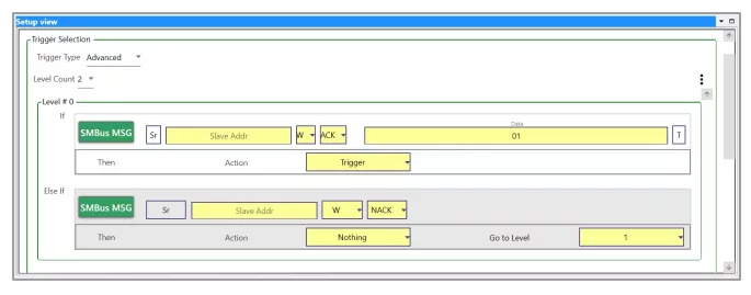 PGY-SMBus-EX-PD supports Auto, simple, and advanced trigger capabilities. The analyzer can trigger on any of the SMBus Protocol packets. Advanced Trigger provides the flexibility to monitor Multiple trigger conditions and can set multiple state trigger machines.