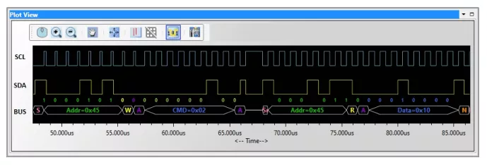 The timing view provides the plot of SCL and SDA signals with a bus diagram. Overlaying of Protocol bits on the digital timing waveform will help easy debugging of Protocol decoded data. Cursor and Zoom features will make it convenient to analyze Protocol in the timing diagram for any timing errors.