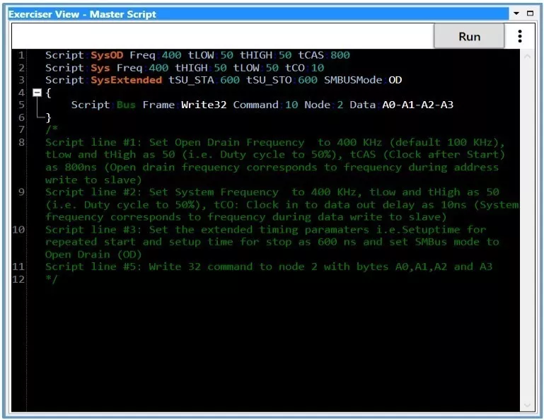 PGY-SMBus-EX-PD supports SMBus traffic generation using GUI and Script. Users can generate simple SMBus using the GUI to test the DUT (Device Under Test). Script-based GUI provides flexibility to emulate the complete expected traffic in the real world including error injections. The script in Figure 4 generates SMBus traffic with the Write 32 command. The comments are included in the script.