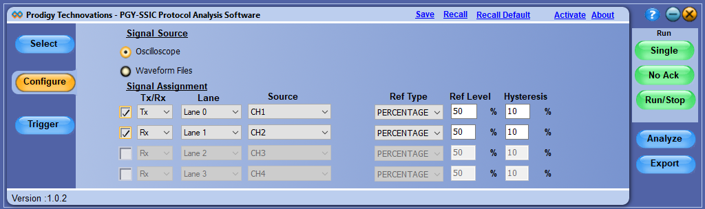 SSIC signal source for protocol analysis could be live channels of oscilloscope or saved wfm file format data Protocol aware trigger leverages Tektronix oscilloscope serial pattern trigger and enables setting protocol trigger Supports Single Acquisition, Repetitive, and No Acq mode using oscilloscope live data