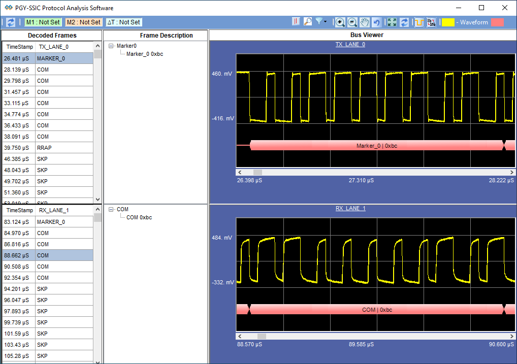 Provides results from PGY-SSIC Protocol Analysis Software. PGY-SSIC Software displays each lane of decoded data. By collapsing, each burst packet provides different frames and content within each frame. PGY-SSIC software links decoded frames of the individual lanes to corresponding electrical waveform in oscilloscope display and helps in correlating protocol activity with physical layer information.