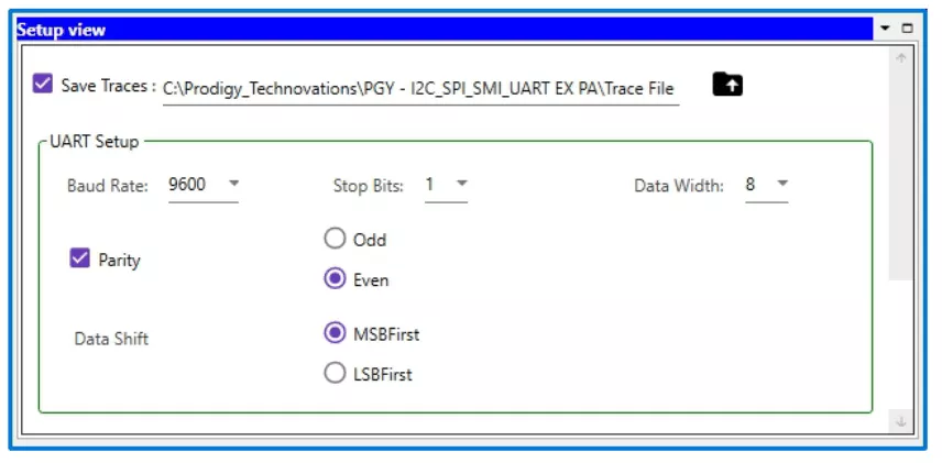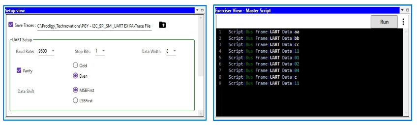 PGY–UART–EX–PD supports UART traffic generation using GUI and Script. Users can generate simple traffic generation using the GUI to test the DUT. Script-based GUI provides flexibility to emulate the complete expected traffic in the real world including error injections. In this sample script user can generate UART traffic as :