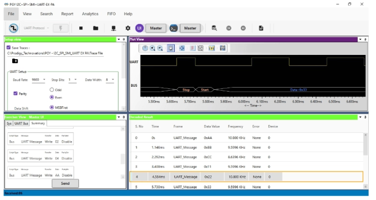 - Simultaneously generate UART traffic and Protocol decode of the bus