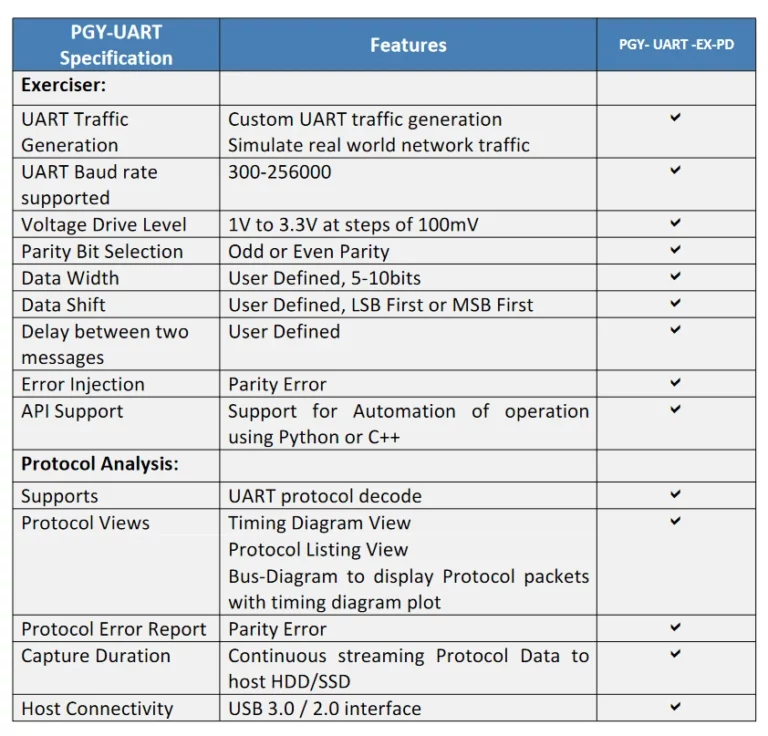 UART Protocol Analyzer (PGY-UART-EX-PD) is the Protocol Analyzer with multiple features to capture and debug communication between the host and the design under test. PGY-UART-EX-PD is the leading instrument that enables the design and test engineers to test the respective UART designs for its specifications by configuring the PGY-UART-EX-PD as Master/Slave, generating UART traffic and decoding the UART protocol decode packets.