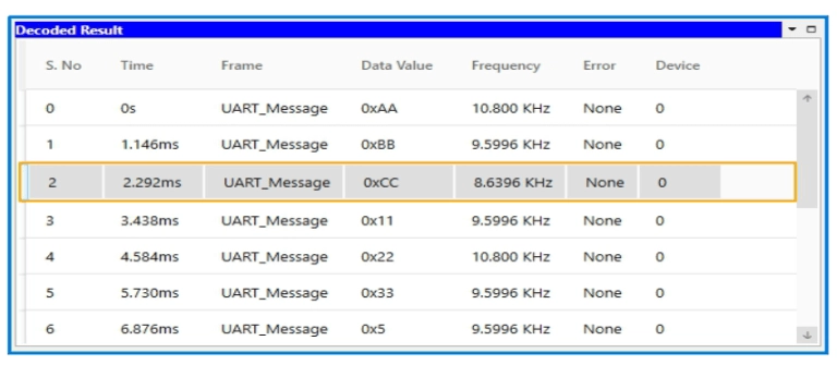 Multi-domain View provides the complete view of UART Protocol activity in a single GUI. Users can easily set up the analyzer to generate UART traffic using a GUI or script. Users can capture Protocol activity at a specific event and decode the transition on the UART line. The decoded results can be viewed in the timing diagram and Protocol listing window with autocorrelation. This comprehensive view of information makes it the industry’s best, offering an easy-to-use solution to debug the UART protocol activity.