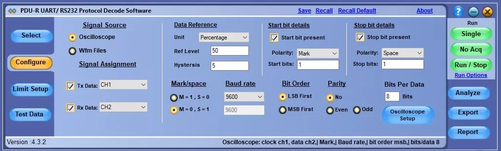 The feature-rich PDU-R UART/RS232 protocol decode software imports the oscilloscope-acquired UART/RS232 data and displays the decoded data in different data formats. PDUR provides flexibility in setting the bits of the number in the stop/start of the UART frame.
