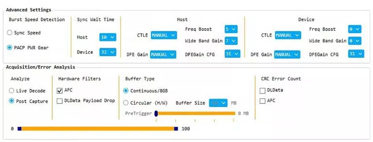 PGY-UFS3.X provides flexibility to the set TX and RX CTLE and DFE equalizer to address reflection and poor SI signals while probing the MPHY signals. This helps in reducing the error decoding of packets. A newly introduced hardware-based circular buffer provides the flexibility to continuously capture the protocol data and analyze the data in circular buffer size. Users can set triggers on the circular buffer and capture the protocol data at specific events.