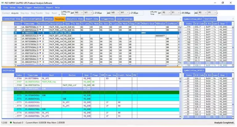 PGY-UFS3.X-PA Software separates the PACP packets in a separate view for easy analysis of power mode change packets and links to UniPro packets. Users can view the MPHY states stall, prepare, and sync information in UniPro view apart from the user selection for L_Data and AFC/NACK Packet details.
