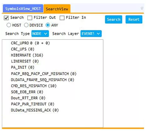 PGY-UFS3.X-PA Software does the live decode and lists all the events. The list of events is shown in this picture. Users can easily note the errors in captured protocol data. In large buffer capture, it takes extremely difficult to locate the errors. But PGY-UFS3.X-PA software simplifies this by listing events while decoding the captured data. Search and Filter allows you directly locate the error events or UFS or UniPro or PACP packet in the protocol listing windows. Filter-in and Filter-out make it easy to view the data of interest in the protocol listing window