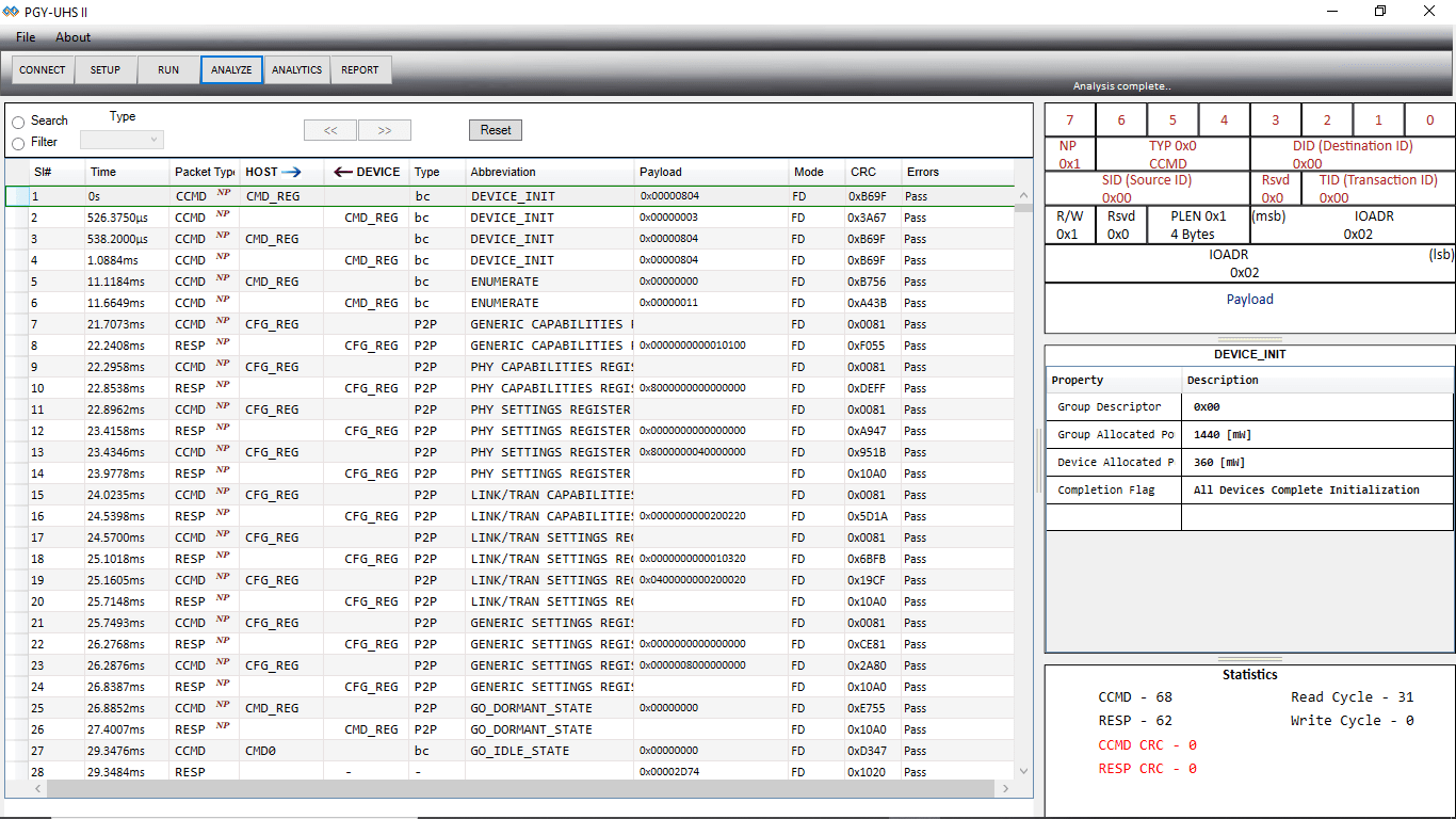 PGY–UHS-II Software provides the industry’s best protocol analysis capabilities. Easy-to-use interface reduces the protocol analysis time. Time-stamped view of protocol decode listing provides an easy view of protocol activities between host and device. At the click of a button, the user can get a decode of the argument of Response from the device. The decoding of registers provides detailed information on devices. Analytics features quickly provide insight into protocol activity without going through the complete protocol activity.
