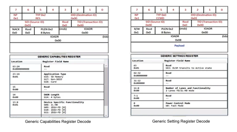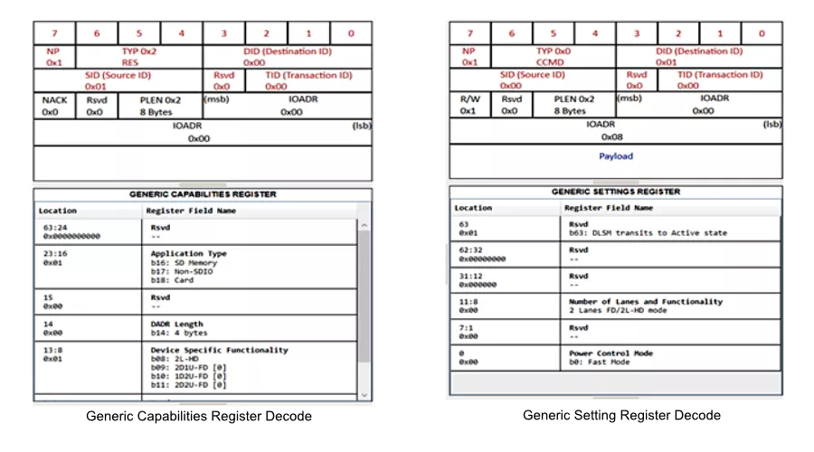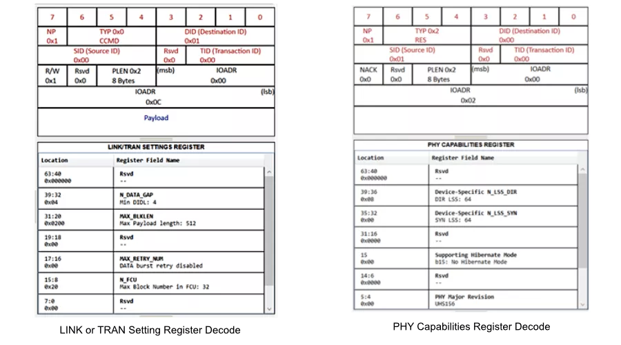 PGY-UHS-II Protocol Analyzer quickly decodes the UHS-II register and displays the register filter name. These decode tables allow identify the host and device setting being set and quickly debug it. The above image displays the Generic capabilities and settings between host and device.